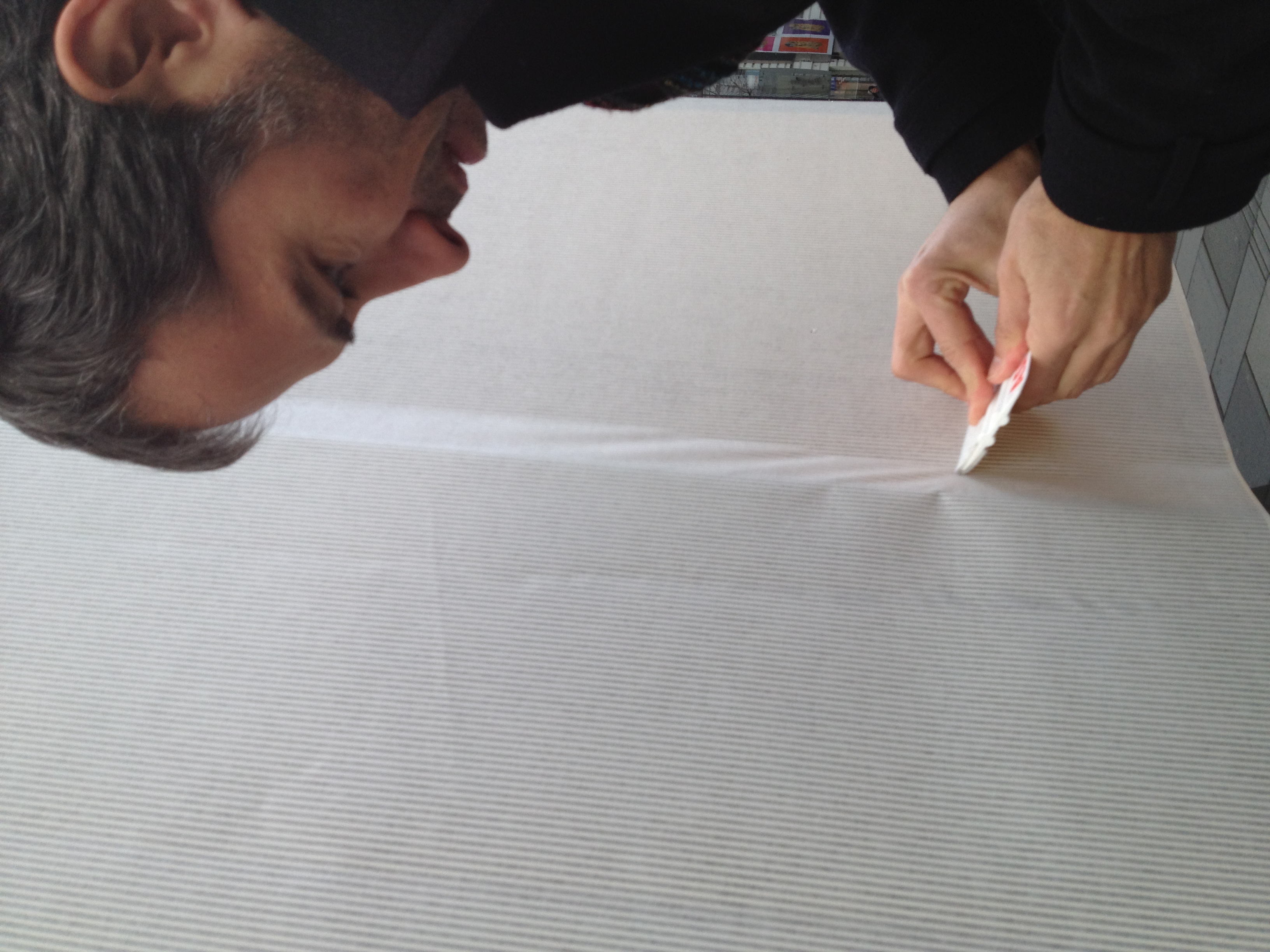 Durch Überlagerung von je einem Rastermuster auf der Fensterscheibe und einem dahinter, entsteht ein grafischer Interferenzeffekt aus der Änderung des Ortes und des Blickwinkels der Betrachter.